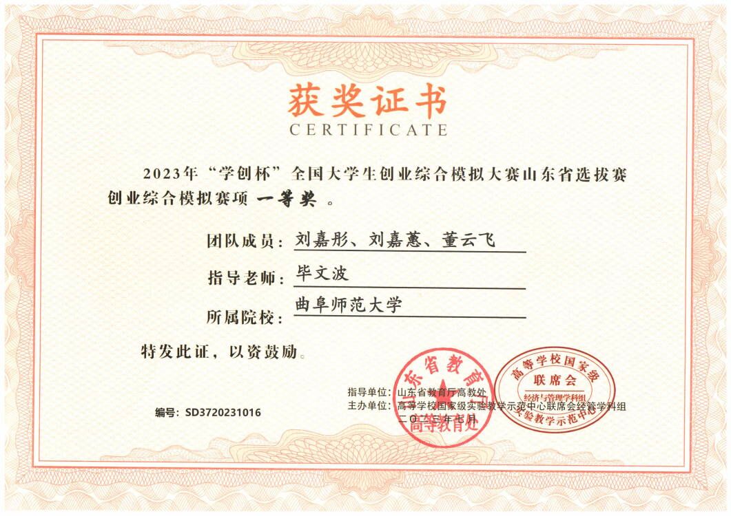 曲阜师大经济学院讯 近日,从“学创杯”全国大学生创业综合模拟大赛中获悉,曲阜师大经济学院学子刘嘉彤、刘嘉蕙、董云飞组成的团队在山东省选拔赛中获得一等奖。