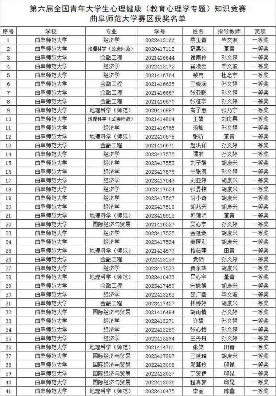 曲阜师大经济学院讯 12月5日,第六届全国青年大学生心理健康(教育心理学专题)知识竞赛圆满落下帷幕。经济学院积极组织学生参与本次大赛,共177名学生获奖,其中一等奖32人、二等奖52人、三等奖61人、优秀奖32人,经济学院喜获第六届全国青年大学生心理健康知识竞赛“优秀组织单位”,辅导员胡康兴被评为优秀心理工作者,辅导员孙义婷荣获优秀指导教师并被聘任为全国青年大学生心理健康知识竞赛专家指导委员会青年专家委员。