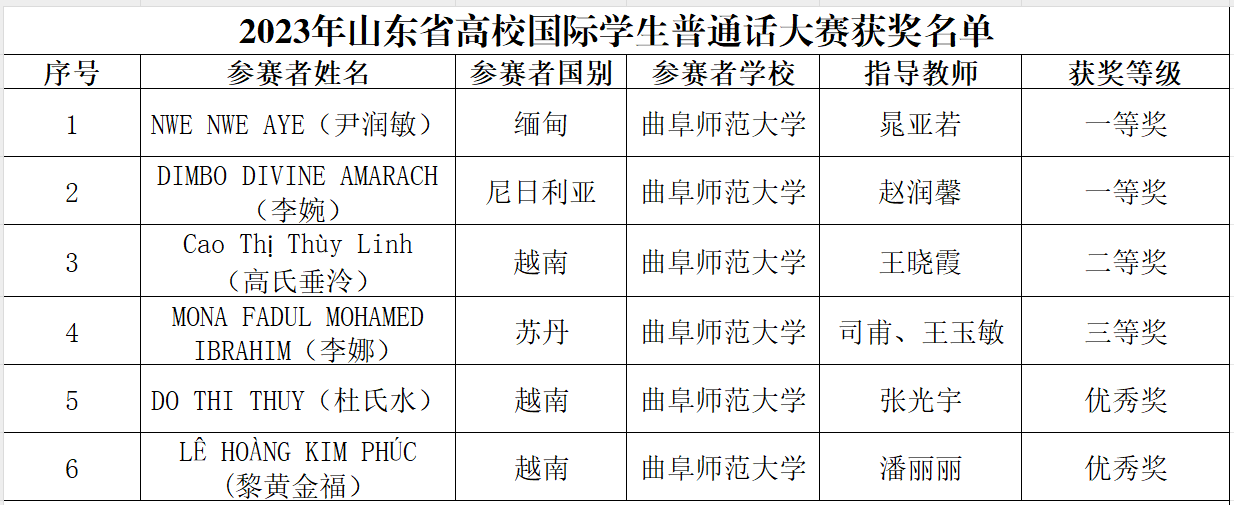 近日,山东省教育厅对2023年山东省高校国际学生普通话大赛获奖名单进行公示,曲阜师大获得一等奖2项,二等奖1项,三等奖1项,优秀奖2项;一等奖共设5名,曲阜师大分获第一名和第五名。同时,晁亚若、赵润馨、王晓霞荣获优秀指导教师,球友会网站登录入口荣获优秀组织奖,朱献贞荣获优秀组织工作者。