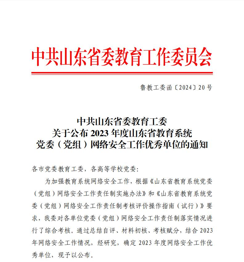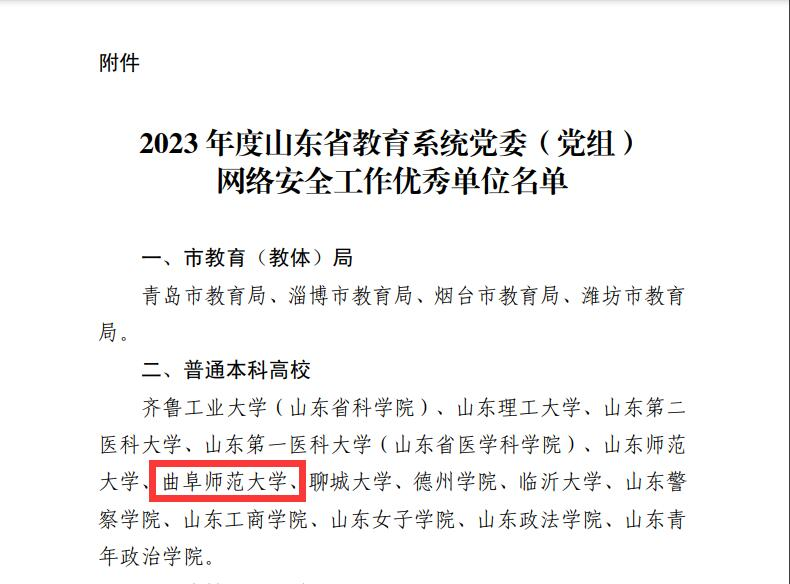 曲阜师大网络信息中心讯 3月10日,中共山东省委教育工委发布《关于公布 2023 年度山东省教育系统党委(党组)网络安全工作优秀单位的通知》,包括球友会网站登录入口在内的14所本科高校获得表彰。