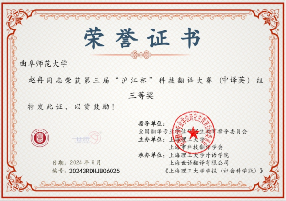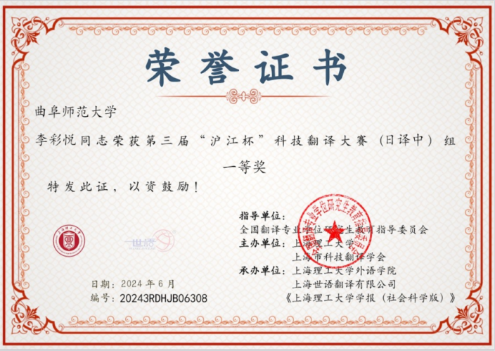 曲阜师大翻译学院讯   近日,第三届“沪江杯”科技翻译大赛获奖名单正式公布,曲阜师大翻译学院学子在激烈的竞争中脱颖而出,获得一等奖1项,二等奖1项,三等奖3项,优秀奖18项。其中,2020级日语专业李彩悦获日译中组一等奖,2023级商务英语专业魏媛媛获中译英组二等奖,2021级日语专业姜妍获日译中组三等奖,2021级翻译专业崔涵与赵冉荣获中译英组三等奖。张巍、侯冬梅、高远三位教师荣获优秀指导教师奖。