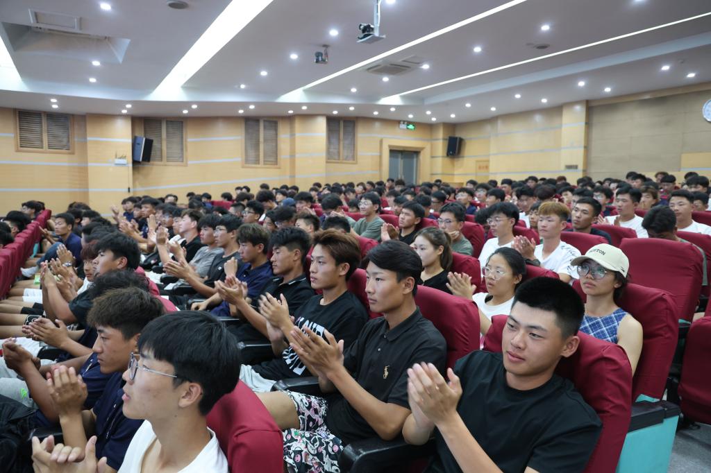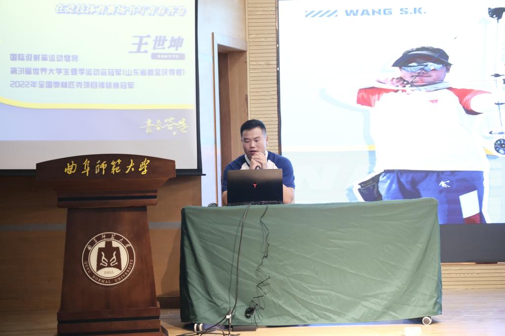曲阜师大体育科学学院讯   为进一步发挥朋辈引领与榜样示范作用,激励广大同学坚定理想信念,明确发展方向,励志成长成才。2024年9月6日晚,体育科学学院面向2024级新生举办“世界冠军思政大讲堂”,邀请第31届世界大学生夏季运动会射箭男子复合弓团体项目冠军、体育科学学院2022级硕士研究生王世坤作《志存高远,脚踏实地,在竞技体育赛场书写青春答卷》报告会。报告会由体育科学学院团委书记刘京主持,体育科学学院辅导员和2024级全体新生参加活动。