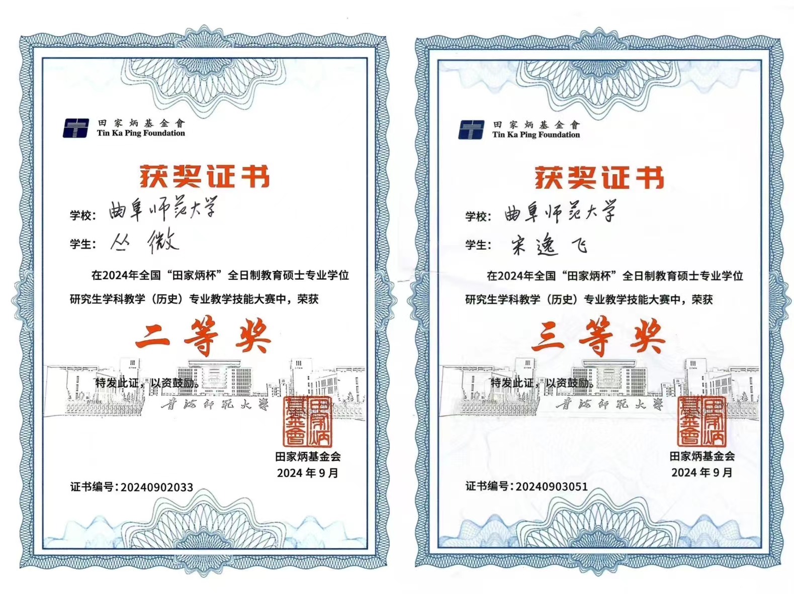 曲阜师大历史文化学院讯 9月23日,全国“田家炳杯”全日制教育硕士专业学位研究生学科教学(历史)专业教学技能大赛决赛成功在青海师范大学落下帷幕。本届比赛共有来自华东师范大学、华中师范大学、东北师范大学等全国83所院校选拔的406名选手报名参加,经过国赛初选,其中161名选手晋级决赛。经过激烈角逐,历史文化学院2023级学科教学(历史)专业研究生丛微荣获二等奖,宋逸飞荣获三等奖,指导教师王昌沛荣获“优秀指导教师”奖。