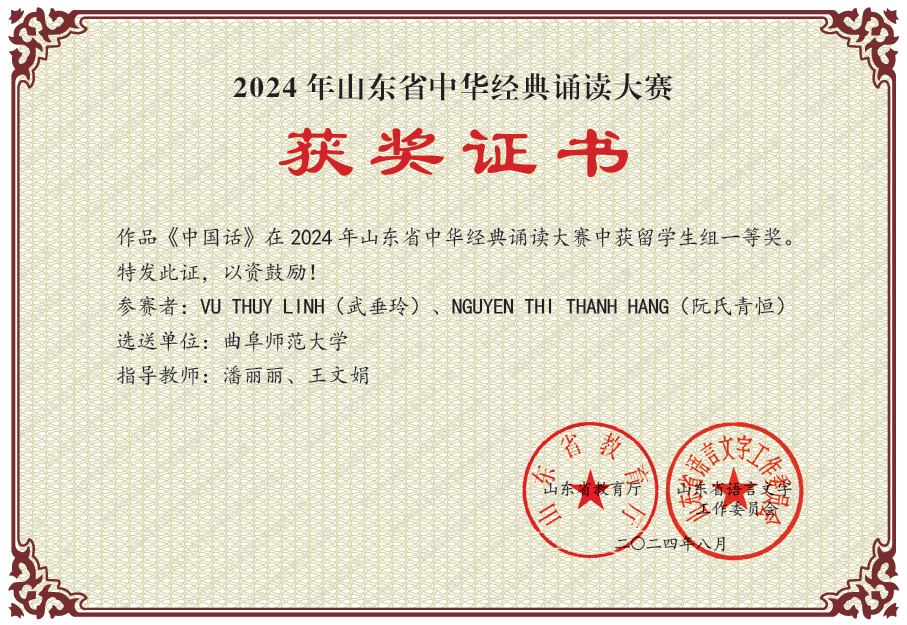 经过初赛、复赛的激烈角逐,曲阜师大留学生在诸多参赛选手中脱颖而出,其中VU THUY LINH(武垂玲)、NGUYEN THI THANH HANG(阮氏青恒)获得留学生组一等奖;TRINH AI NHU(郑爱柔)获得二等奖;潘丽丽、王文娟两位老师获得优秀指导教师奖。