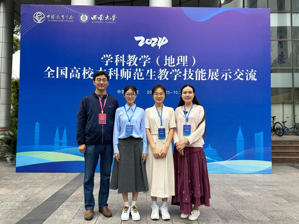 2021级地理科学(师范M)专业王婧同学和2022级地理科学(师范)专业由京鹭同学,在李剑、吴军老师指导下,分别获小组第一名和第四名,均被评为“未来优秀地理教师”。与此同时,两位同学还获得最佳教学课件、最佳教学仪态、最佳教学语言和最佳师生互动等5个奖项专项奖。王婧同学成为全国仅有的三位本科生代表之一,受邀参加中国教育学会地理教学专业委员会2024年综合学术年会展示交流活动,全国著名地理课程与教学论知名专家、华东师范大学夏志芳教授对授课展示进行了点评。